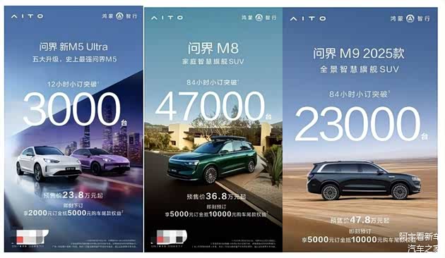 3月,问界销量再传捷报!问界旗下推出的三款新车预订火爆:问界新M5 Ultra,开启预订12小时便突破3000台;问界M8,开启小订84小时销量便超47000台;问界M9 2025款,同样在84小时内小订突破23000台。这一系列的小订捷报,进一步夯实了问界在高端市场的领先地位。