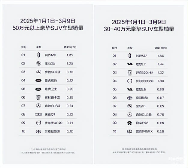 近段时间,问界在市场上势头不减,销量持续攀升。在1月1日-3月9日的销量排行中, 问界M9稳居50万元以上豪华SUV车型销量销冠,持续引领科技豪华新格局;问界新M7持续领跑30-40万元豪华SUV市场,刷新中国新能源豪华品牌新纪录。