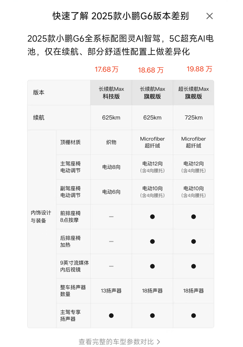 2025 款小鹏 G6三个配置的区别 主要是一些舒适性方面的区别 都是后驱,顶配续航 多了 100km 个人觉得最低配就够了 因为从我体验 P7+的感受来看 这个按摩力度真的不太行 最低配性价比最高,中配也不错