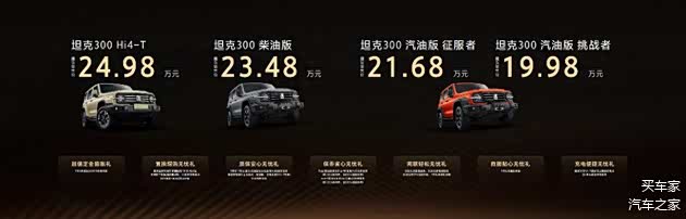 2025年3月10日,2025款 坦克300正式上市,新车共推出三款动力组合产品,分别是坦克300汽油版,厂家指导价为19.98万元-21.68万元;坦克300Hi4-T,厂家指导价为24.98万元;坦克300柴油版,厂家指导价为23.48万元。随之新车上市,厂家还提供了七重购车礼遇,让用户购车用车可以享受更多的权益。