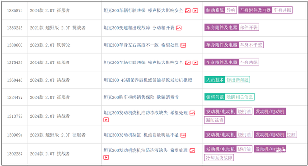 话虽这么说,可事实又是如何呢?临近3·15,打开国内某知名投诉平台可以看到, 坦克300因发动机拉缸、烧机油、发动机渗油、车内异响、变速箱漏油、主驾驶座椅处漏风等问题遭到大量车主投诉。而坦克500还存在变速箱异响、变速箱跳挡、油表不准、失速甚至自燃的投诉。