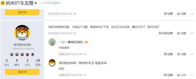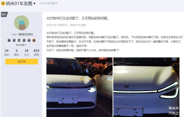 车灯问题上,不少车主都反馈出现“东边不亮西边亮”的问题,甚至哪一个灯什么时候出问题“无法预测”。还有车主表示高速路上也出现远光灯无法切换等问题。乐观的纳米01车主甚至调侃自己的座驾“拥有自动修复功能”——因为放上几个小时又自动恢复了,这也算是苦中作乐吧。