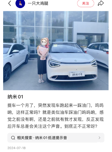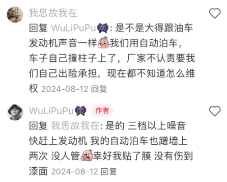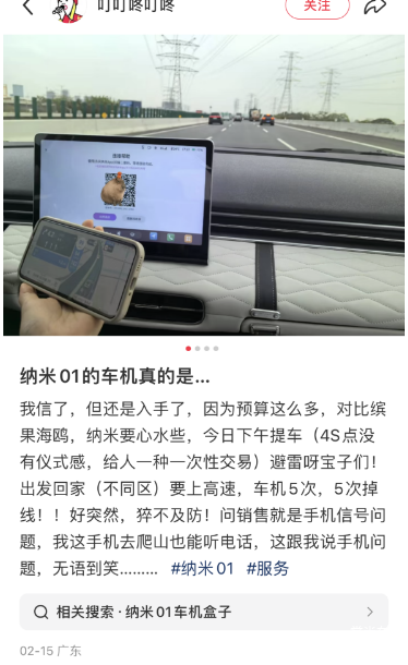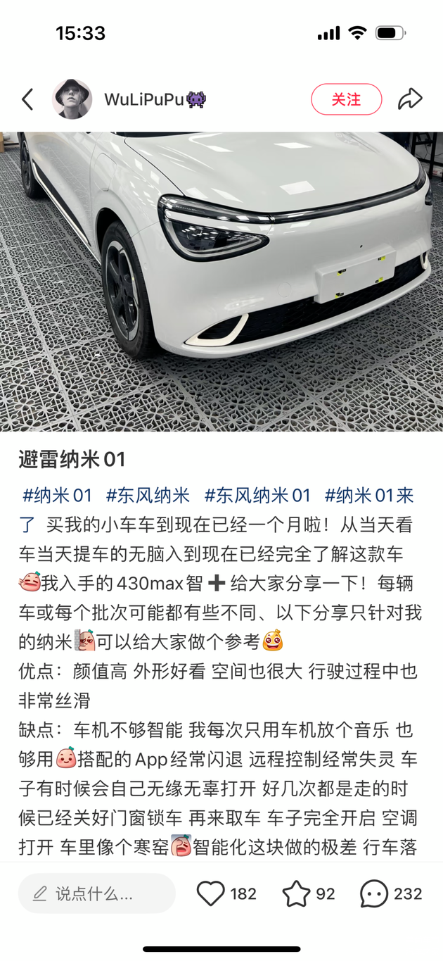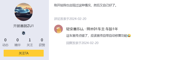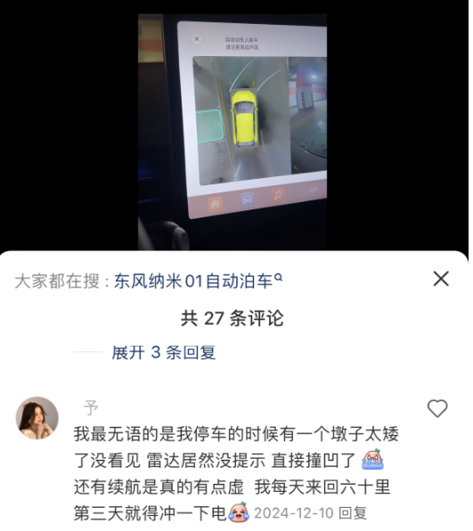 其实按理说这个价位的车有自动泊车算是越级配置了,但是从一些车主反馈来看,纳米01的这套自动泊车系统显然还不是太过关,容易出现障碍物识别不准的情况。按我的理解,这个价位就算没有自动泊车也没什么,怕的就是这种“画虎不成反类犬”,吃苦的只能是消费者。
