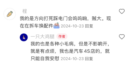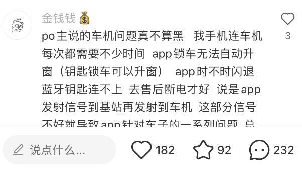 车机问题就更多了,从不少车主的反馈总结来看,常见的关联问题包括但不限于经常黑屏闪退、APP连接容易掉线、远程锁车经常失灵等。其实这个价位的车车机的水平一般完全可以接受,但从车主们的体验来看,显然这款车的车机用“一般”来形容都是在恭维它了。