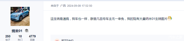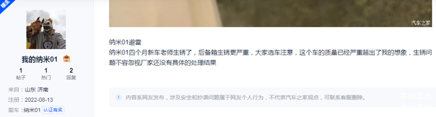 从网友的反馈和评论来看,纳米01的后备箱在提车几个月后就出现生锈问题,从图片来看应该是集中在螺丝等连接部位,显然在材料和工艺方面该车型或有欠缺。