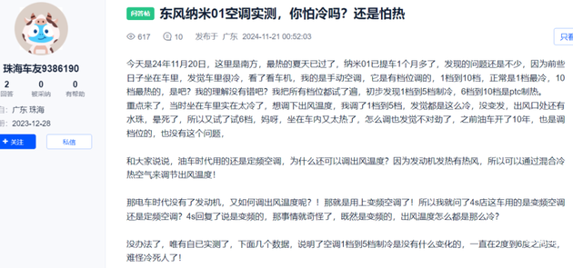 还得是车主有探究精神。纳米01这款车的空调有10个档位调节,1-5档是制冷,6-10档是制热,但是有车主自己测试了一下1档和5档的温度,发现差别只有0.2摄氏度,也就是说这空调的档位只能调节风速的大小,温度你是没法调节的,难怪很多车主吐槽说空调打开会冷死人。