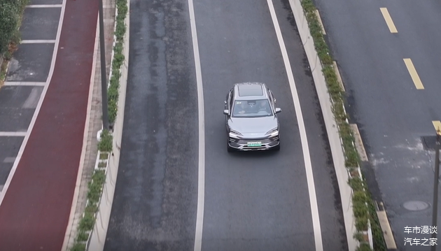江北大道快速路上有多个大角度弯道,海豹06 DM-i能够结合导航地图与实时道路感知数据,智能选择车道。在第一个弯道时,车辆根据周围车辆情况,选择了最外侧车道行驶,在整个行驶过程中,车辆始终通过微调方向,保持行驶在车道中心线,而且神奇的是,由于车辆通过扫面左侧车道车辆的行驶轨迹,判断出左车有侵入的危险,迅速提速到系统允许的最大值——88公里快速过弯。坐在车内,我几乎感受不到明显的侧倾,整个转弯过程丝滑顺畅,舒适感满满。