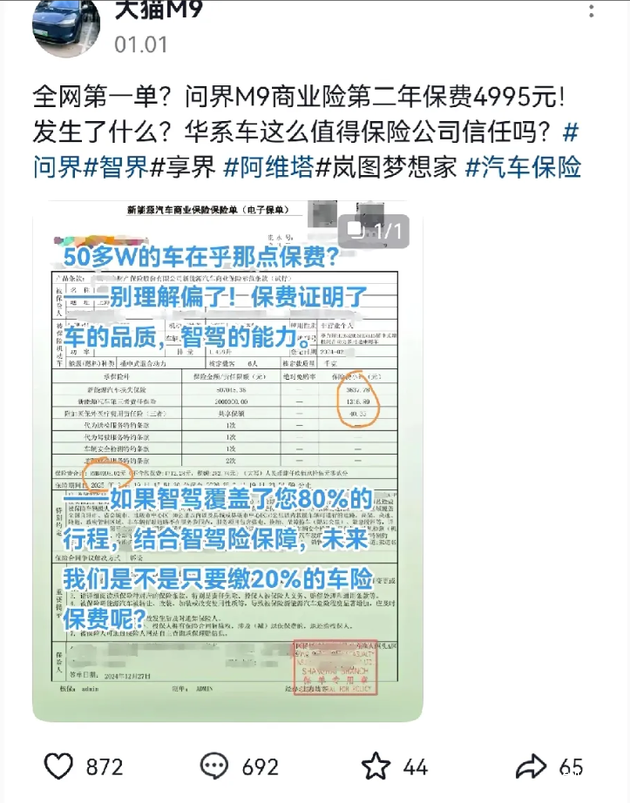 最近有个现象让很多人看不懂:售价50多万的 问界M9,每年保费只要5000元左右,而某些20多万的车型,保费竟然要交到9000多块!这个对比直接让很多老司机都惊掉下巴。