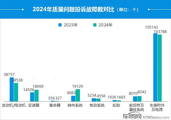 2024年,车身附件及电器依旧是投诉焦点,占据了过半数的份额,“仪表台开裂”取代“混动模式转换故障”成为投诉最多的故障点,2009款之前的老款日系车型成为“罪魁祸首”。相对而言,转向系统本年度变身“大黑马”,投诉故障数出现翻倍增长,“转向系统异响”是投诉增长的主要来源,集中在部分美系品牌车型。