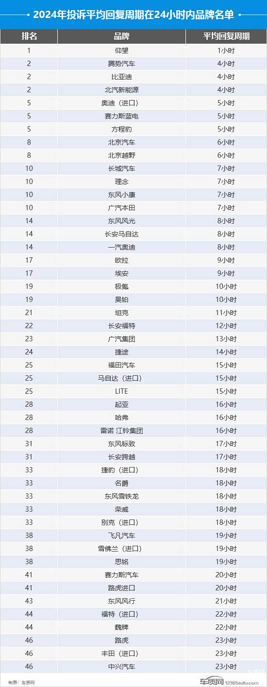 从投诉平均回复周期来看,共有48个汽车品牌的回复周期缩短至24小时以内,与2023年相比增加了7个品牌。其中,自主品牌占比超过了6成,且多数品牌的回复周期要好于合资和进口品牌。值得一提的是,方程豹品牌的回复周期由2023年的13天6小时大幅压缩至5个小时,充分展现出车企对于消费者诉求的重视和积极解决问题的态度,表现值得肯定。