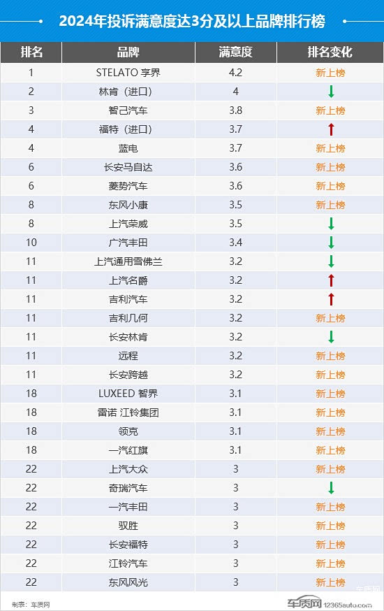 2024年车质网接到的投诉中已得到消费者评分的品牌达209个,与2023年相比增加了29个。其中,满意度评分达3分及以上的品牌共28个,较2023年增加了2个,自主品牌在其中的占比接近7成,同比提高了17.9个百分点。具体到榜单,多数为新上榜品牌。发布不到1年的全新品牌享界,首次上榜便排名首位,满意度表现可圈可点。作为榜单常客的吉利汽车,本年度满意度得分有所提升,值得鼓励。