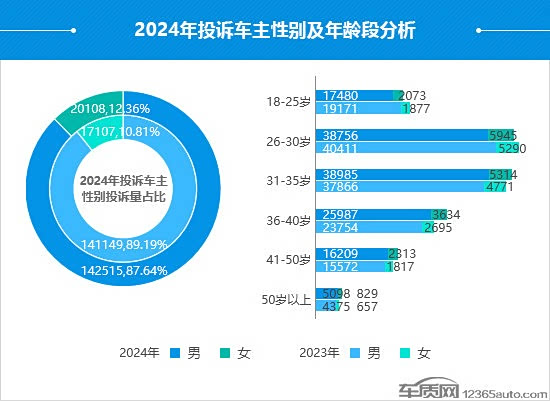 从2024年投诉车主性别占比来看,男性车主虽然仍是投诉主体,但投诉占比较2023年略有下降。相比之下,女性车主针对汽车问题的维权意愿有所增强,2024年的投诉占比达到了近9年来的最高点。此外,2024年投诉车主年龄段仍集中在26-35岁之间,但占比较2023年略有下降。36-40岁的中年车主成为新的投诉增长点,其中,女性车主的投诉涨幅超过了同期的男性车主,同比上涨34.8%。从投诉类型来看,36-40岁的女性车主对于服务问题更为关注,投诉占比较2023年提高了3.6个百分点。