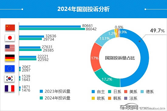 具体到国别投诉分析,自主品牌依旧一家独大,投诉占比接近总量的一半。美系品牌延续了上一年度的增长势头,投诉量再创新高,接近9成的投诉出自质量问题,投诉故障点集中在“转向系统异响”和“方向盘不正”。相对而言,日系品牌2024年的投诉量出现冲高回落,但仍保持在高位。其中,2023款车型成为投诉焦点,投诉量不降反升,同比上涨52.9%,故障问题多为“颗粒捕捉器堵塞”。