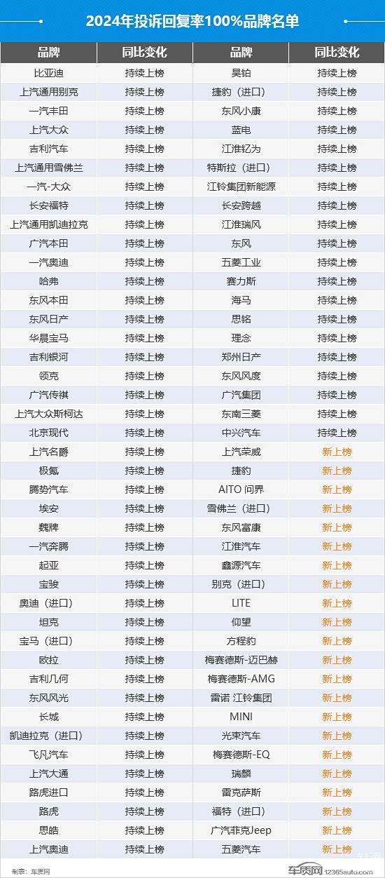 2024年投诉回复率达到了100%的品牌共84个,较2023年增加了13个,自主品牌占比超过一半。其中,新上榜品牌为22个,同比持平。AITO问界作为自主新势力品牌的代表,凭借对于消费者诉求的及时回应荣登本年度榜单,望再接再厉。相比之下,本年度持续上榜品牌达到了62个,创造了新的历史纪录。比亚迪、上汽通用别克、上汽大众、一汽-大众等老牌车企连续多年上榜,对于消费者诉求的重视态度始终如一,值得肯定。以上是投诉回复率为100%的品牌榜单(排名不分先后)。