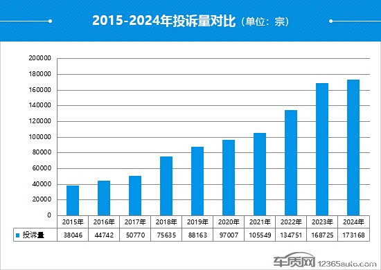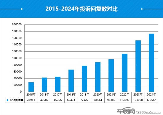 作为国内领先的缺陷汽车产品信息收集平台,车质网2024年共受理消费者针对汽车产品的有效投诉173,168宗(含第三方平台和后装轮胎投诉共199宗),较2023年上涨2.6%,同比增速放缓。其中,共涉及273个国内汽车品牌的1,695款车型。随着车企对车质网发送的消费者实名投诉问题重视程度日益提高,2024年共有149个品牌受理了车质网发送的投诉,与2023年相比增加5个,其中投诉回复率达100%的品牌共84个,较2023年增加了13个。
