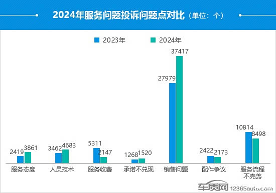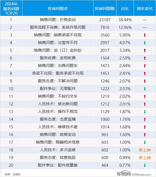 从服务问题投诉问题点来看,销售问题是导致服务问题投诉量大涨的“元凶”,投诉问题数同比上涨33.7%,占比超过6成,较2023年提高了近10个百分点。大部分投诉增量都集中在 “价格变动”。此外,服务态度和人员技术的投诉问题数同比也出现了明显增长,前者涨幅接近60%,“不解决问题”和“态度蛮横”是车主投诉的焦点。