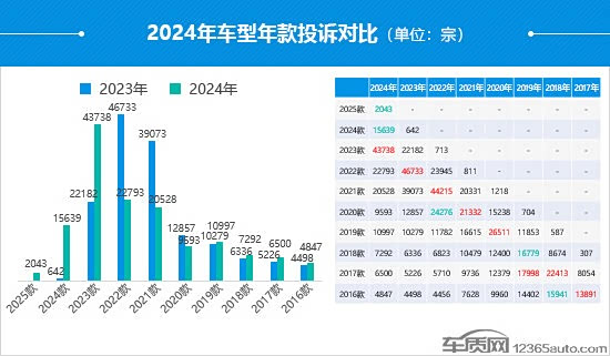 2023款车型成为本年度投诉量最高的车型年款,同比涨幅翻倍,投诉增量大多来自于服务问题,“价格变动”成为投诉焦点,部分自主品牌新能源车型贡献了绝大部分的投诉量。从各车型年款近8年来的投诉变化趋势可以发现,绝大多数车型年款在下一年都会出现投诉量涨幅翻倍的情况,如2021款车型在2022年投诉量翻倍,“次年款”车型往往成为投诉“重灾区”。随着车型保有量的不断累积,以及使用周期的延长,一些故障问题开始浮出水面。据此推断,2024款车型(次年款)在2025年将成为投诉主体,保守估计,投诉量将突破3万宗。