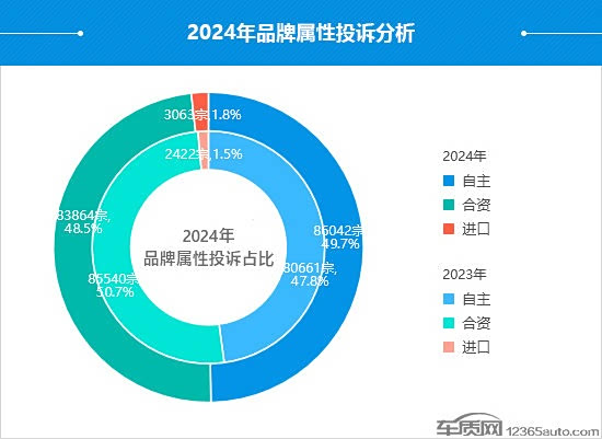 2024年,阶段性投诉爆发的情况此起彼伏,与服务问题有关的投诉陆续浮出水面,特别是在销售环节出现的问题成为消费者关注的焦点,从而推动车质网总投诉量再创历史新高。从2024年的投诉类型来看,服务问题的投诉量再度突破4万宗,投诉占比较2023年出现大幅提升。销售问题成为服务问题的投诉重灾区,投诉问题点集中在“价格变动”和“系统升级问题”,两者占比之和超过投诉总量的一半。特别是前者,在2024年曾多次出现爆发,已成为服务问题中最大的“毒瘤”。可以预见的是,伴随着汽车市场“价格战”的持续升温,车企针对汽车产品的促销手段和力度也将继续加码,2025年“价格变动”将再次成为服务问题的投诉焦点。从品牌属性来看,自主品牌的投诉占比时隔6年再次超过合资品牌,投诉量也达到了历史顶点,超过6成的投诉来自质量问题,投诉故障点聚焦“影音系统故障”和“车身生锈”,侧面也反映出自主品牌车型在车身工艺以及车辆软硬件匹配方面存在一定问题。从能源类型来看,插电式混合动力车型的投诉占比逐年扩大,与其不断增长的市场份额形成正比。2024年,其投诉主体已从质量问题转变为服务问题,多数集中在售前方面。