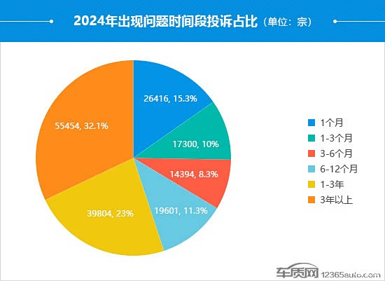 从出现问题时间段投诉占比情况来看,购车3年以上出现问题的投诉占比持续扩张,较2023年提高了7.8个百分点,已接近总量的1/3。“仪表台开裂”依旧是投诉最为集中的投诉故障点,投诉故障数同比基本持平。值得注意的是,“部件老化”和“转向系统异响”成为投诉增长点,同比分别上涨37.3%和138.3%,与部分日系老款车型和美系品牌车型投诉量持续高企有关。相比之下,购车12个月内出现问题的投诉占比近5年来首次降至5成以下,同比减少5.1个百分点,质量问题虽然仍是投诉主体,但所占份额正逐步被服务问题吞并。