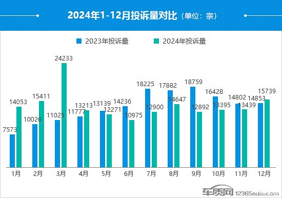 2024年3月份受多款车型爆发共性问题的影响,投诉量创纪录地突破了2万宗,较2023年同期涨幅超过1.1倍。整体来看,2024年共有5个月份的投诉量同比出现增长,其中,1月份和2月份的涨幅均超过了50%。相比之下,9月份的投诉量同比降幅最大,较2023年同期下降31.3%。
