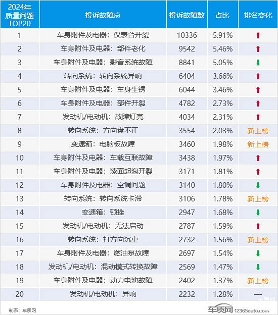如图所示,2024年质量问题TOP20中,共有10个投诉故障点都来自于车身附件及电器,与2023年持平。值得注意的是,本年度新上榜的5个故障点中,有3个是来自于转向系统。其中,“方向盘不正”排名靠前,投诉故障数同比涨幅超过2.2倍,投诉集中在部分美系品牌车型。从榜单排名来看,“仪表台开裂”取代“混动模式转换故障”排名榜首,是唯一投诉故障数破万的投诉故障点。值得注意的是,“发动机/电动机故障灯亮”排名跻身榜单前10位,投诉故障数同比上涨43.7%,超过7成的投诉来自于部分美系和自主品牌汽油车型。此外,“动力电池故障”首次现身榜单,奇瑞新能源小蚂蚁等自主品牌新能源车型成为投诉增长点。