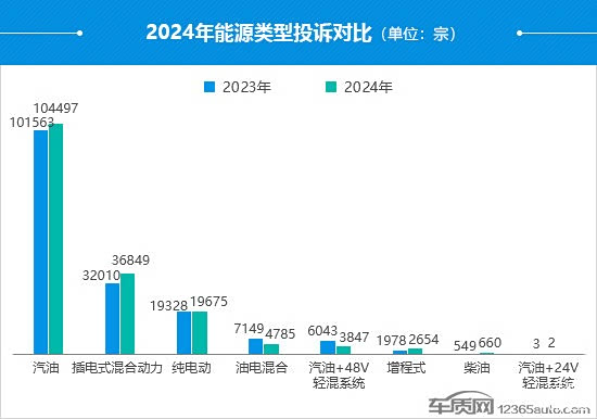 从近10年的投诉量走势可以看出,整体呈现逐年递增的态势,在经过2022年和2023年的高增长后,2024年投诉量增速开始放缓。与2023年相比,新能源车型为2024年投诉量增长提供一定助力,其投诉占比已超过总量的1/3,同比提高了2.5个百分点。