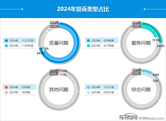 车质网投诉类型分为质量问题、服务问题、其他问题和综合问题投诉四部分。2024年,质量问题依然是投诉主体,投诉量同比微增,但占比较2023年略有下降。自主、美系和日系品牌是其投诉的主要来源,三者占比之和超过了总量的8成。同期,服务问题出现明显增长,投诉量同比上涨33.3%,占比较2023年提高了5.7个百分点,投诉增量主要来自于自主品牌,与部分热销新能源车型有关。此外,其他问题的投诉量保持同比连续增长的势头,与2023年相比提高了41.2%,投诉集中在部分自主和日系品牌车型。