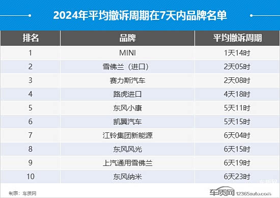 相比于投诉回复率和响应速度,能否在最短的时间内妥善解决消费者提出的合理诉求则体现出车企化解危机问题的效率和解决能力。据车质网数据显示,2024年共有10家汽车品牌的平均撤诉周期保持在7天以内,较2023年减少1家,自主品牌占据多数。其中,MINI表现较2023年有跨越式进步,周期从22天23时缩短至1天14时,排名榜单首位。此外,东风纳米连续2年进入榜单,在针对消费者诉求解决方面表现值得肯定。