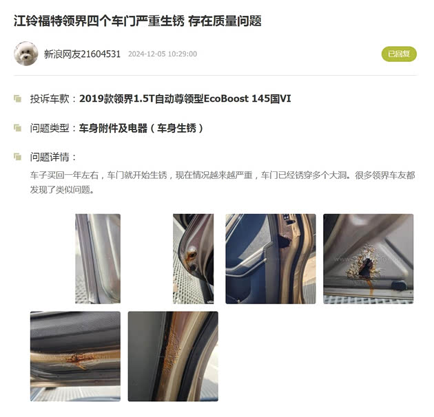 至于外界所重点关注的车身生锈问题,就有车主在质量投诉网站上表示,自己买的是2019款领界1.5T自动尊领型EcoBoost 145国VI,新车刚买回来仅一年就已经发现了车门生锈的问题,而随着时间的推移,生锈问题也已经越来越严重,甚至车门已经锈穿了多个大洞,同样的问题在不少领界车型上都存在。