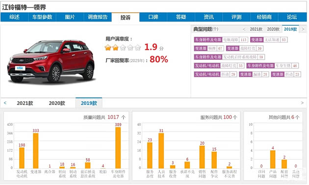 除了车身生锈这一硬伤外,车质网上关于福特领界其它方面的投诉同样不少,最严重的就是电瓶故障问题,仅2019款车型上就有113起投诉,其次就是变速箱问题,包括无法加速、顿挫、故障灯亮等,这些都是福特领界普遍存在的通病,严重的甚至无法正常行驶。