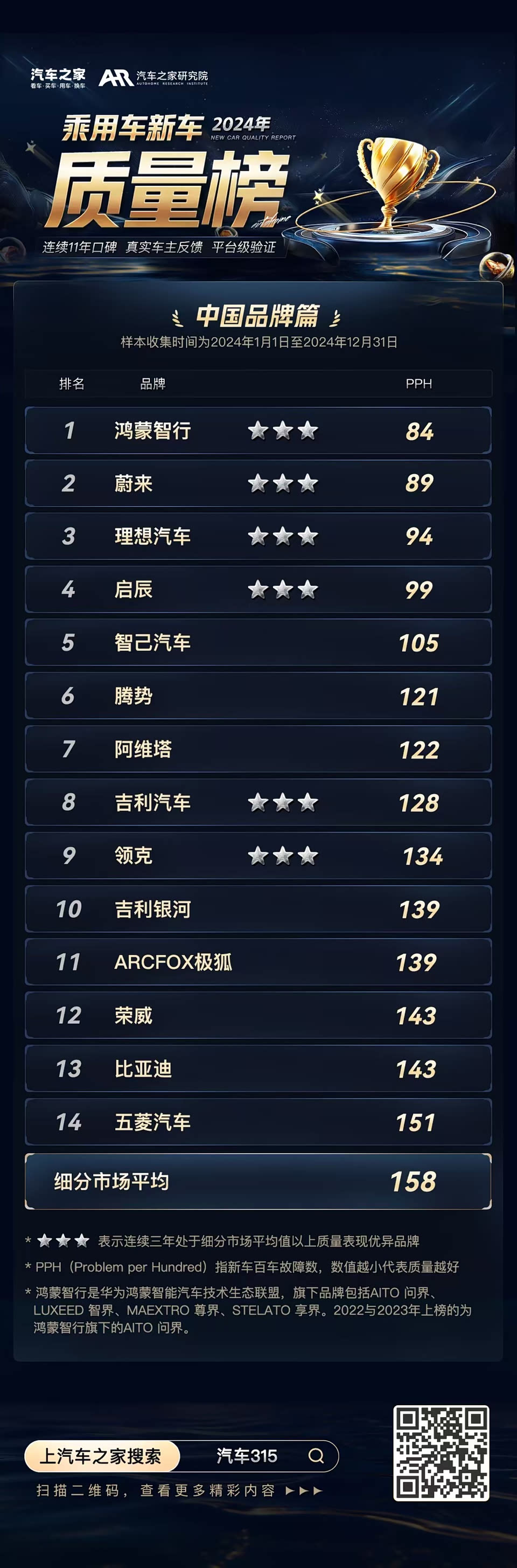 品质铸就口碑,实力赢得未来。此次荣获汽车之家2024年中国品牌乘用车新车质量榜第1名,是对鸿蒙智行品质的高度认可。