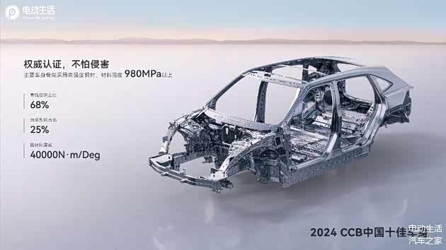 车身采用68%高强度钢,热成型钢占比25%,使整车扭转刚性达40000牛·米/度,在12000吨一体化压铸全铝电池壳体配合下,让车辆的车身完整性和安全性的得到了提升。