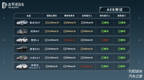 在AEB极限挑战中,星纪元ET与问界M7成为唯二通过120km/h静止假车测试的车型,展现出其在制动系统与感知算法方面的绝对优势。面对横穿电单车(80km/h通过)、左转遇行人(35km/h通过)、倒车遇行人(40km/h通过)等场景,星纪元ET均稳居第一阵营;相比之下,理想L6在倒车避障中“挂科”,特斯拉则因本土化不足成绩垫底。