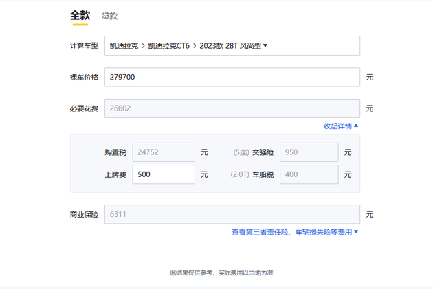 除了基础的用车、养车成本之外,买新车用户还需要缴纳商业保险和必要花费,凯迪拉克CT6是一款2.0T、5座车,所以交强险的费用为950元、车船税为400元,上牌和购置税分别为500元和24752元,必要花费共计26602元。商业保险的第三方责任险按50万赔付额度来看,凯迪拉克CT6的商业保险为6311元。