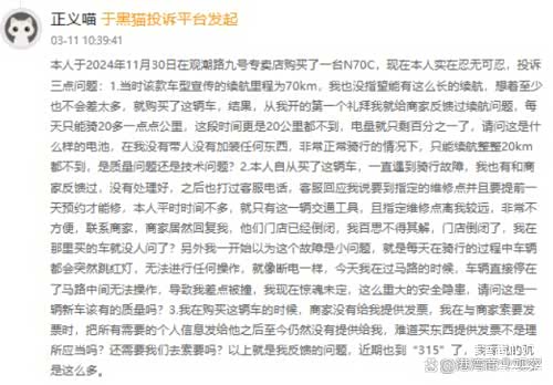 爱玛电动车于黑猫投诉平台共有1596条投诉,已完成1033条。近期在质量方面的投诉集中于“车辆功能问题、宣传功能与实际不符、转向灯失灵、大灯暗近光看不清、电动车歪头、油门控制器失控、购买初期零件掉落、电池续航不如老款”等,在服务方面的投诉集中于“售后拖延时间、上牌售后虚假承诺、售后服务态度不佳”等。