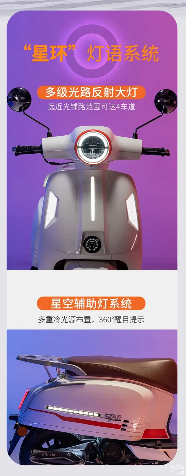 「视觉系」玩家必入!星环灯语系统首创360°冷光源警示,远近光覆盖四车道,星空灰/伽马蓝/电磁白三色特调车漆经3万小时暴晒测试不褪色。超低座高740mm配合95kg轻量化车身,155cm小个子也能脚尖触地轻松扶车,加厚防滑坐垫+低位脚踏让双人骑行舒展不局促。