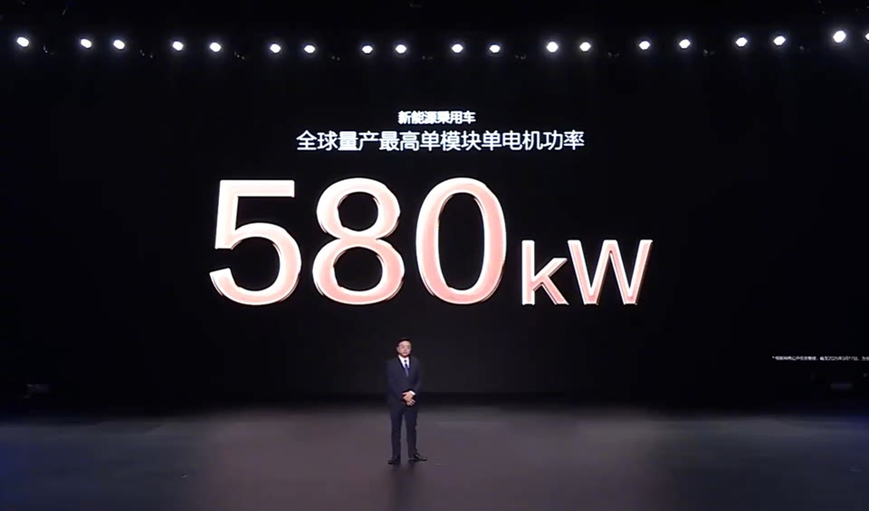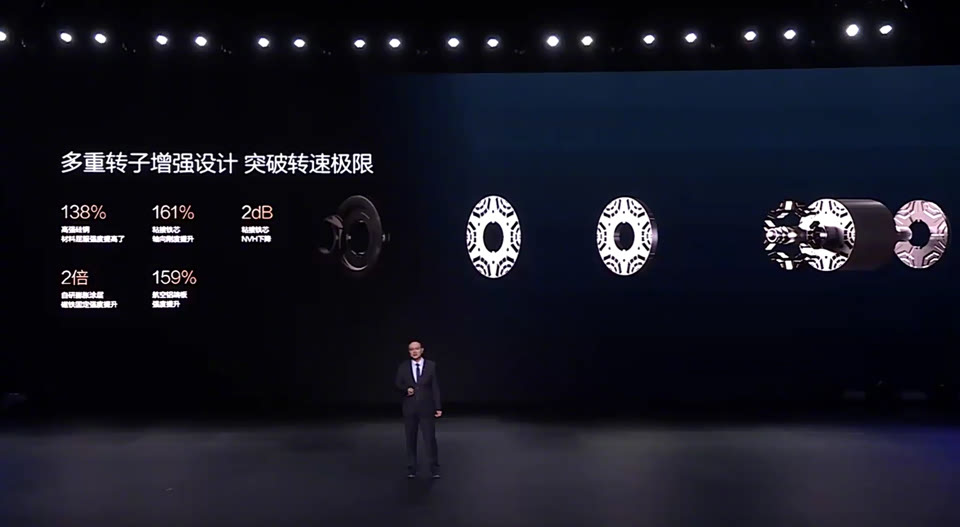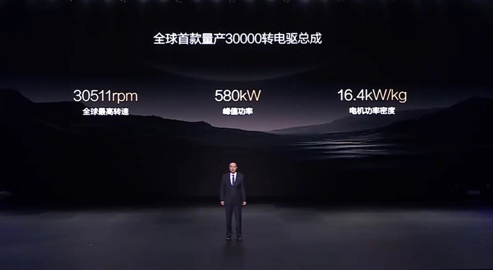 该电机核心优势是超高转速与极致功率密度,性能指标达三个全球量产第一,包括最高转速30511 rpm、最高单电机峰值功率580kW、最高峰值功率密度16.4kW/kg,性能超越传统V12发动机。