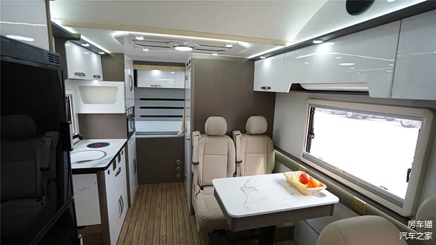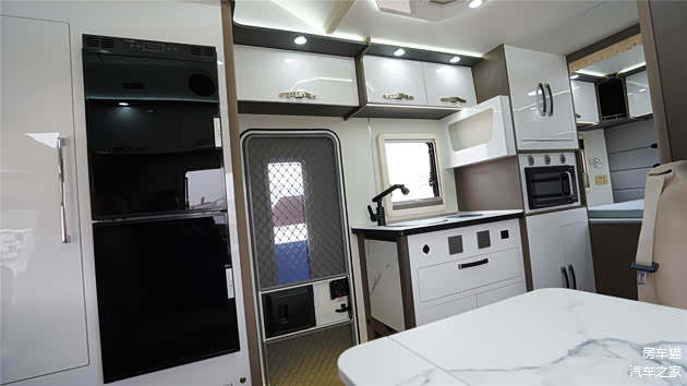 厨房区位于会客区的对面,配备有房车专用冰箱、微波炉、电磁炉以及洗菜池等烹饪设施。厨房区的设计既实用又美观,为用户提供了舒适的烹饪环境。