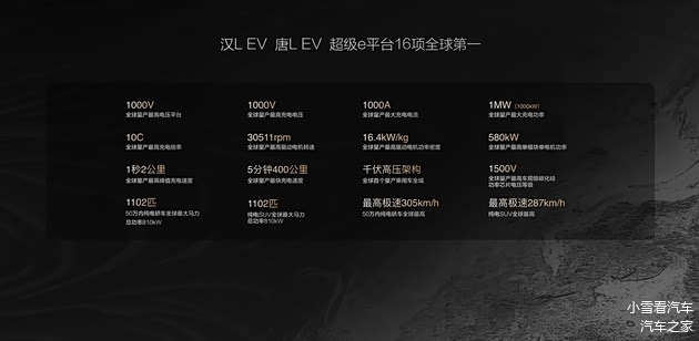 设计之外,超级e平台的首搭,更为汉L EV、唐L EV创造了16项全球第一!新车拥有1000kW的充电功率,远超电动方程式新规的600kW充电功率。兆瓦闪充5分钟,畅行400公里,足以满足用户两周的通勤所需,以及4小时的高速驾驶,把电动车带入了油电同速的新时代!