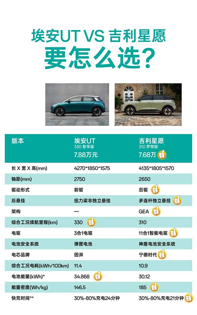 最近试了不下十款电动小车,发现7万价位的水比想象中深得多。今天拿两款热门车,吉利 星愿和埃安UT说点大实话,准备买代步车的建议全文背诵。