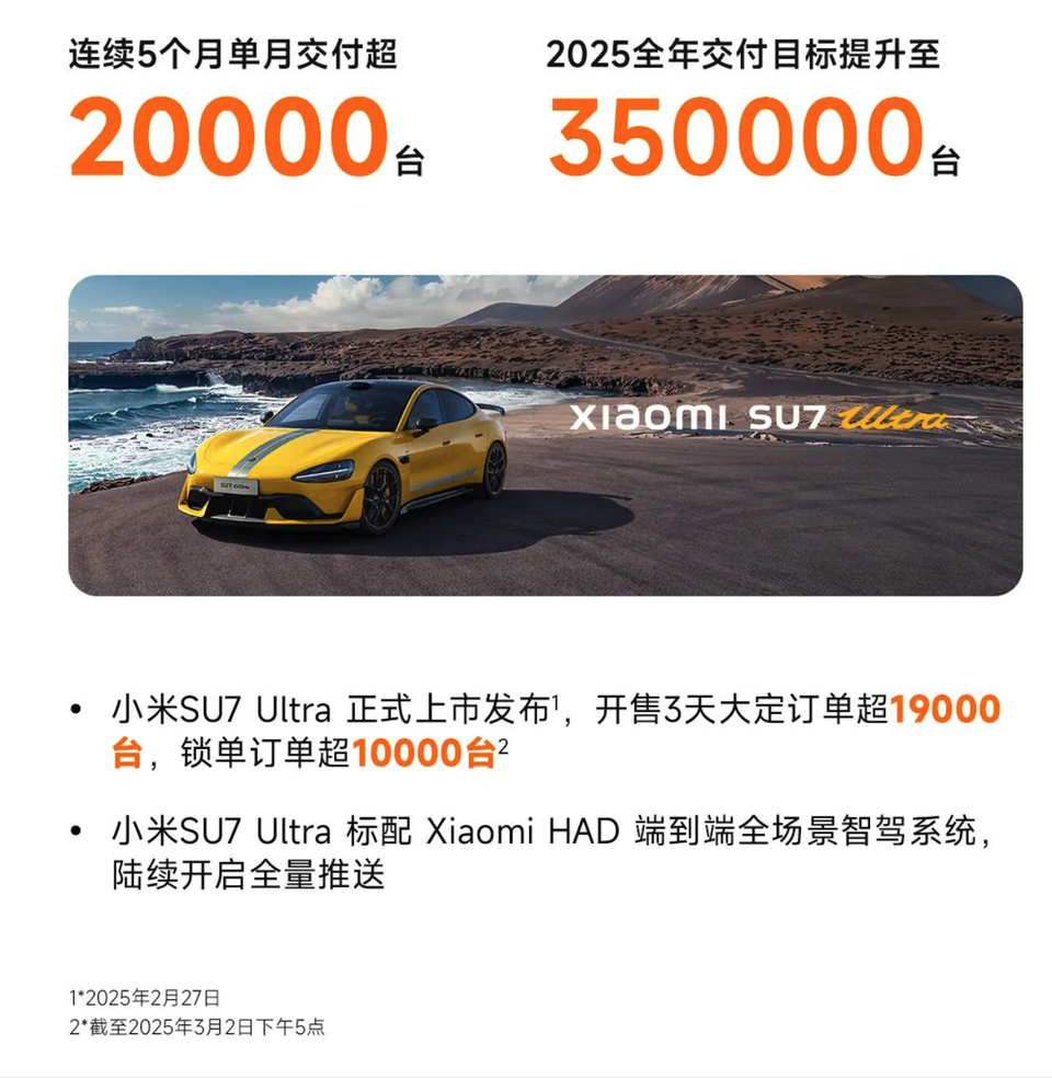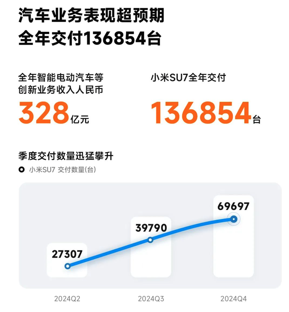汽车这块表现超预期,全年智能电动汽车等创新业务收入328亿元,2024年交付新车136854台,连续5个月单月交付超20000台。2025全年交付目标提升至350000台。小米SU7 Ultra 正式上市发布,开售3天大定订单超19000台,锁单订单超10000台。