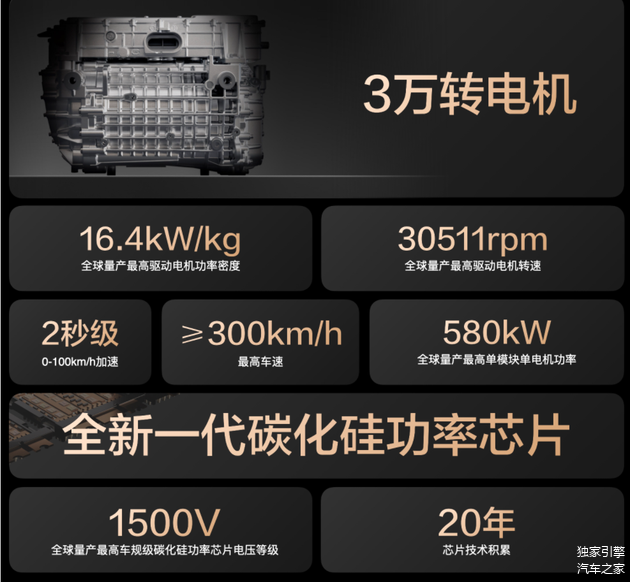 同期发布的全球首款量产3万转电机,相较于主流电机不仅体积更小、重量更轻,而且电机转速相较于行业平均水平直接提升了近50%,带来了更强的动力性体验。