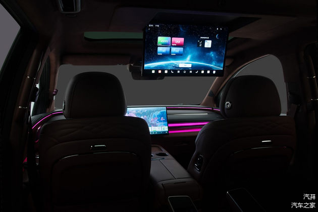 在后排,这款车采用了六座设计,第二排拥有宽大厚重的独立零重力座椅,并且在内侧扶手位置分别配备了一块控制屏;而在第二排头顶,昊铂HL也配备有吸顶大屏。这种传统豪华与科技豪华相结合的风格,属实也能给人带来一些新的体验。