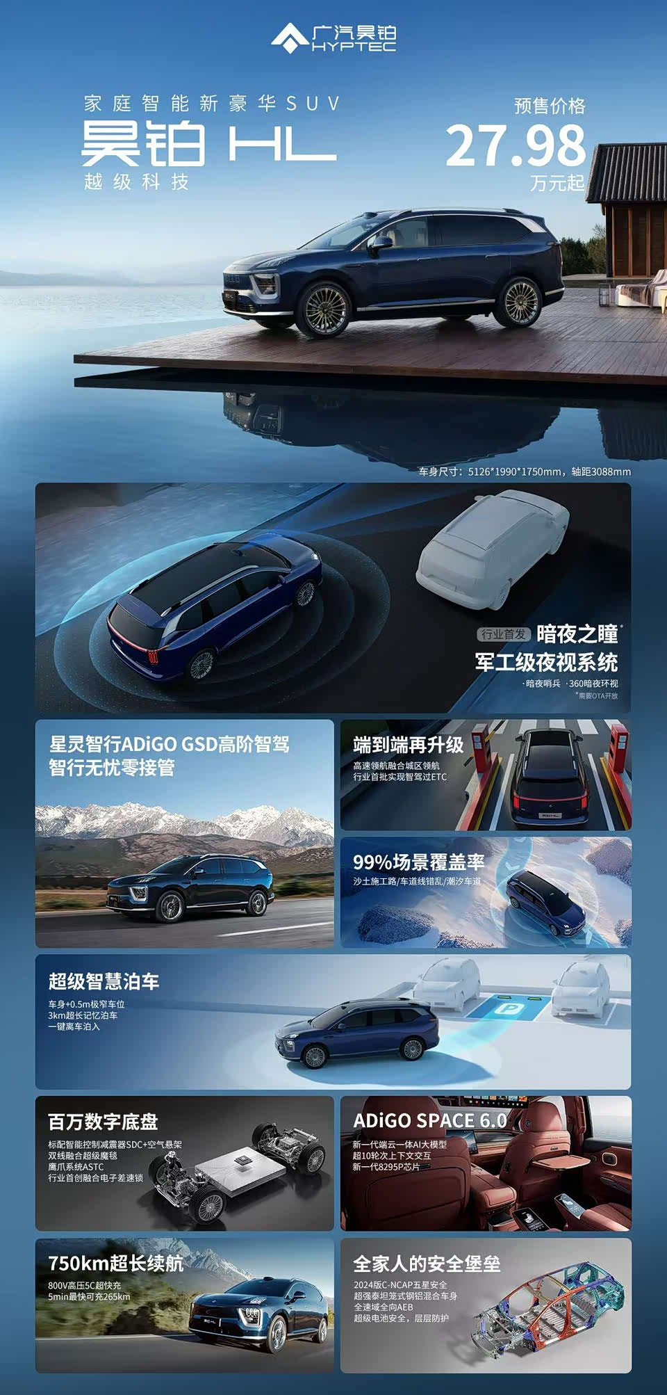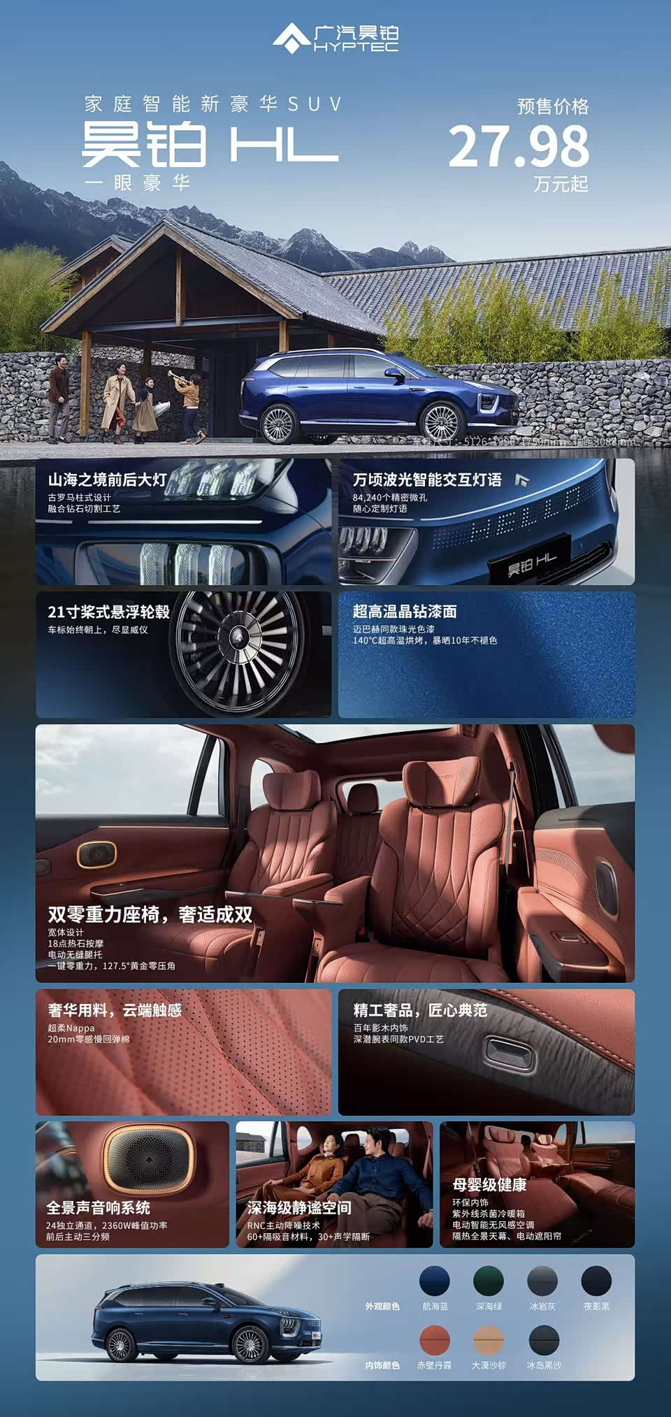 车盟快讯:昊铂30万级大六座SUV昊铂HL今晚开启预售,新车共推出6款车型,预售价区间为27.98万-32.98万元,现在下订还可享999元抵5000元尾款,至高10000元置换补贴等的购车权益,新车搭载同级唯一双零重力座椅,全系配备激光雷达,标配800V高压平台/全铝合金底盘,大家觉得新车的诚意如何?