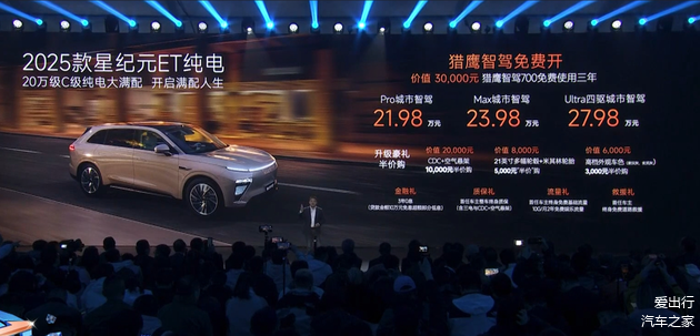 3月18日,星途汽车隆重推出了2025款星纪元ET纯电版,此次共发布了Pro、Max、Ultra三款不同配置,售价区间为21.98万至27.98万元。作为年度改款车型,新车在智能化与续航性能上实现了显著提升,全系均配备了“猎鹰智驾700”系统以及高通骁龙8295P座舱芯片,以“增配不加价”的策略,强势进军中高端纯电SUV市场。通过优化配置结构、强化核心性能,2025款车型进一步提升了性价比,有望赢得家庭用户及科技爱好者的青睐。