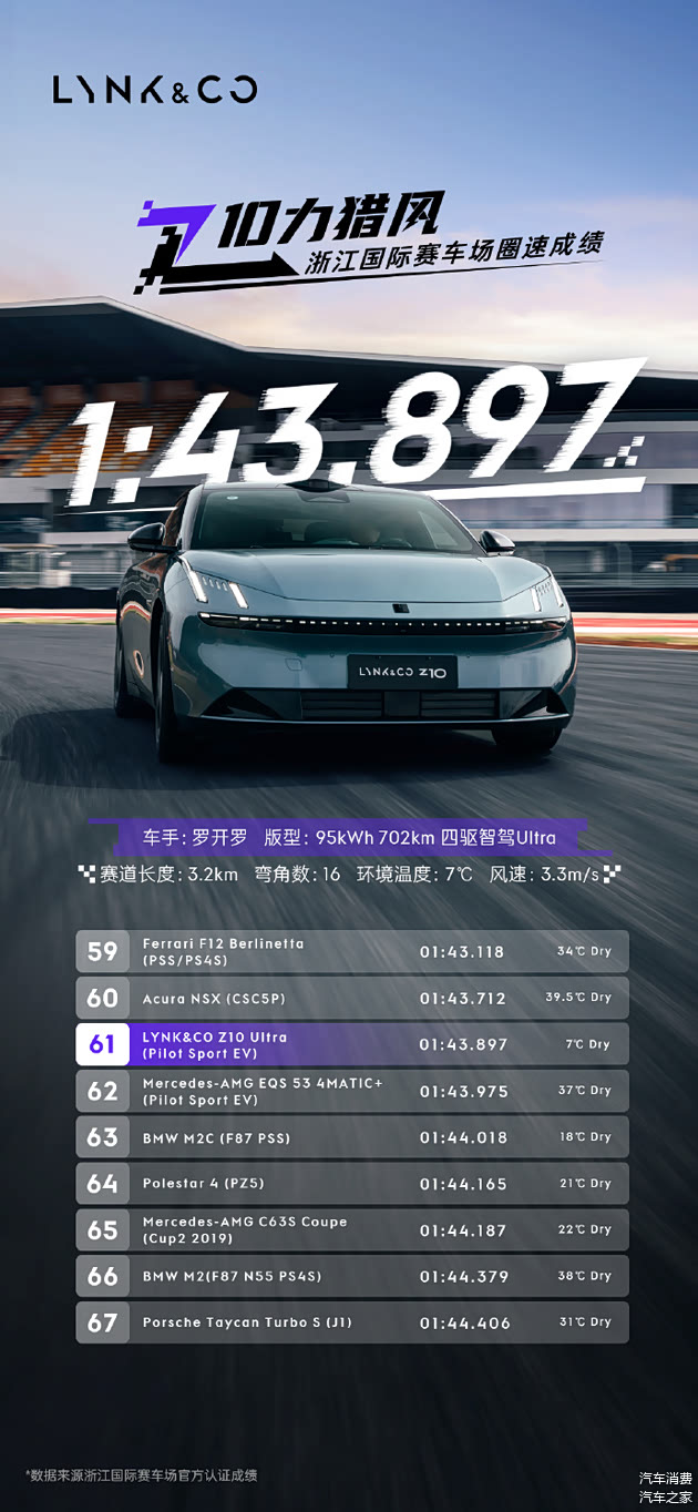 领克Z10在浙江国际赛车场圈速成绩为1:43.897,这一成绩是它在浙赛实力的直观体现。它用实际行动证明了量产车也能在专业赛道上展现卓越性能,打破了赛道是富人专属的固有观念。领克Z10不仅在浙赛中表现出色,还成功挑战了天津V1国际赛道和宁波国际赛车场,分别取得1:16.12和2:04.751的圈速成绩。
