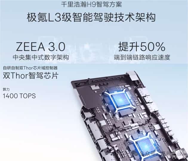 ZEEA 3.0中央数字架构提高了响应速度,5个激光雷达实现了全方位感知,而双Thor芯片间的零延迟通信确保了高效算力利用。