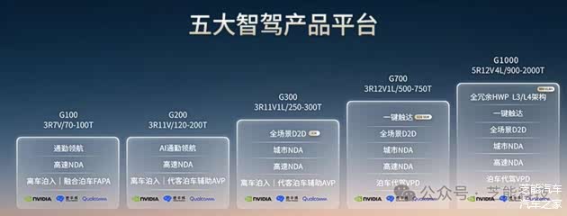 广汽推出五大智驾产品平台,算力覆盖70 TOPS至2000 TOPS,传感器从纯视觉到多传感器融合,芯片采用英伟达、地平线等品牌,功能覆盖高速领航、城市领航及L3/L4场景。