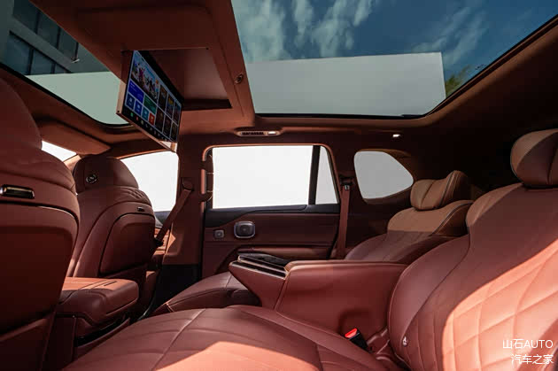 昊铂HL分别提供5座和6座布局,其中6座车型采用2+2+2的布局设计,第二排为两张独立的商务座椅,准确的说更像是航空座椅,除了支持电动调节之外,还具有座椅加热、通风、和按摩功能,在座椅扶手上的触控屏幕上就可以进行操作,在车顶上上方还配备了一块17.3英寸大屏幕,相当于车载电视,可以通过车内的网络或者手机投屏进行操作,缓解了长途乘坐的无聊感。