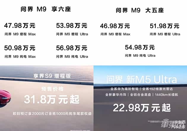 其中新款问界M9仍然分为了五座和六座版本,五座版本增程版分为Max和Ultra两个版本,售价分别为:46.98万元和51.98万元;纯电Ultra版本的售价为54.98万元。